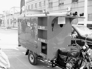 寧波鎮(zhèn)海區(qū)澥浦鎮(zhèn)十七房村是遠(yuǎn)近聞名的明清古建筑保護(hù)區(qū),巷深路窄,萬一起火,普通消防車根本無法進(jìn)入。但該村53歲的村民蔣志軍卻“因地制宜”發(fā)明制造了一輛三輪“消防車”,專門備著以防意外。